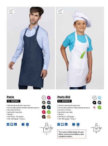 • Delantal largo de adulto de cuerpo entero. • Delantal de niño largo de cuerpo entero. • Delantal de adulto de medio cuerpo. • Delantal mini.